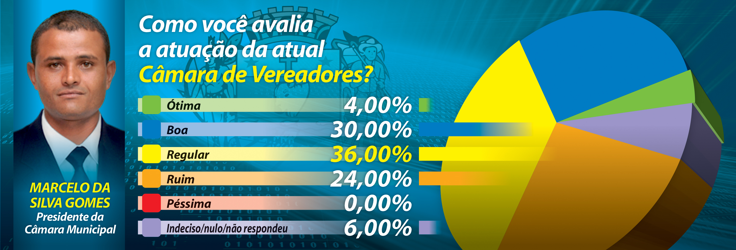 Quanto a avaliação dos populares para a atuação dos vereadores da atual gestão há um equilíbrio dentre as opiniões populares. De fato, classificaram como “ótima” ou “boa” a atuação dos edis 34% dos entrevistados (33% em Abril); como regular 36% (32% em Abril). Reprovam as ações legislativas 24%, que afirmaram ser “ruins” ou “péssimas” (32% na pesquisa anterior).