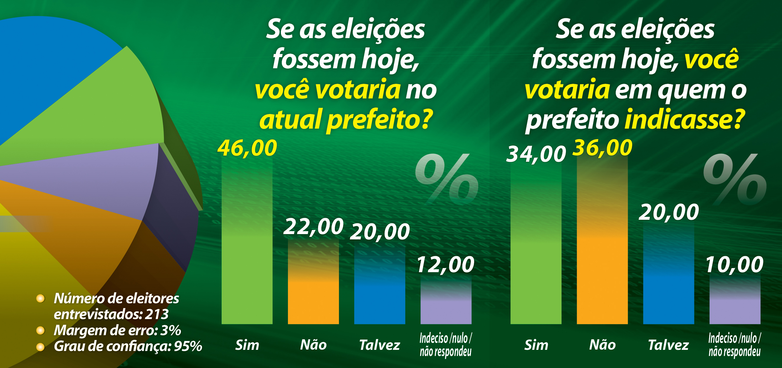 Outro quesito submetido à avaliação popular foi com o objetivo de auferir o índice de transferência de votos do atual prefeito, caso ele opte por apoiar outro nome e desista da tentativa de reeleição. Nesse quesito o maior índice foi daqueles que afirmaram que “não” votariam no nome indicado pelo atual prefeito: 36%. Na pesquisa de Abril esse índice era de 29%. Outros 34% dos entrevistados afirmaram que seguiriam a indicação do alcaide (contra 16% na anterior) e 20% disseram que “talvez” votariam num candidato por ele indicado.