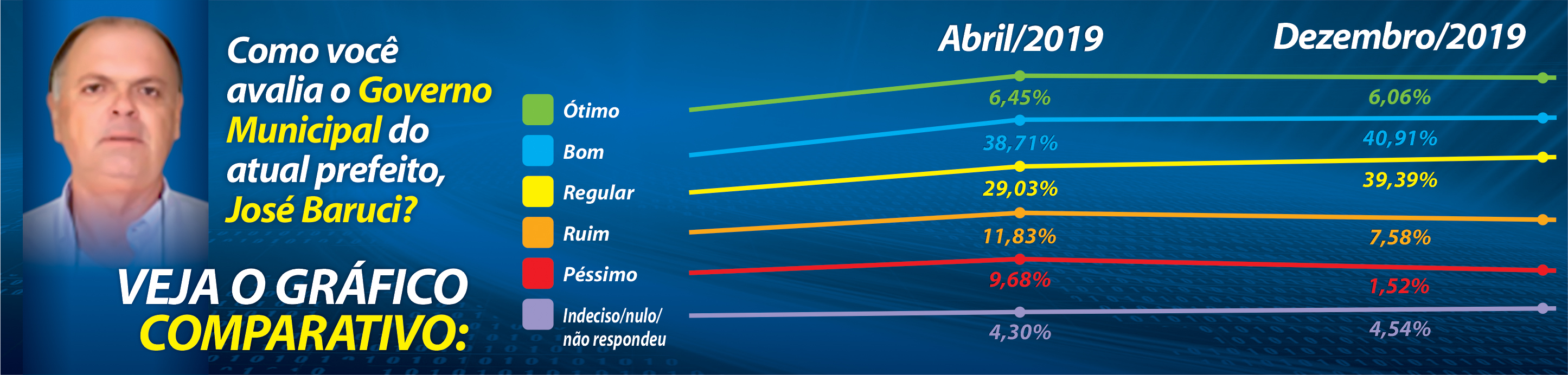 Comparado os dados desta pesquisa idêntico procedimento realizado em Abril deste ano, temos que naquela oportunidade 45% aprovaram o governo Baruci (atualmente são 46%); outros 29% consideraram “regular” (hoje são 39%), enquanto que 21% afirmaram rejeitaram-na, considerando-a “ruim” ou “péssima” (agora são apenas 9%).