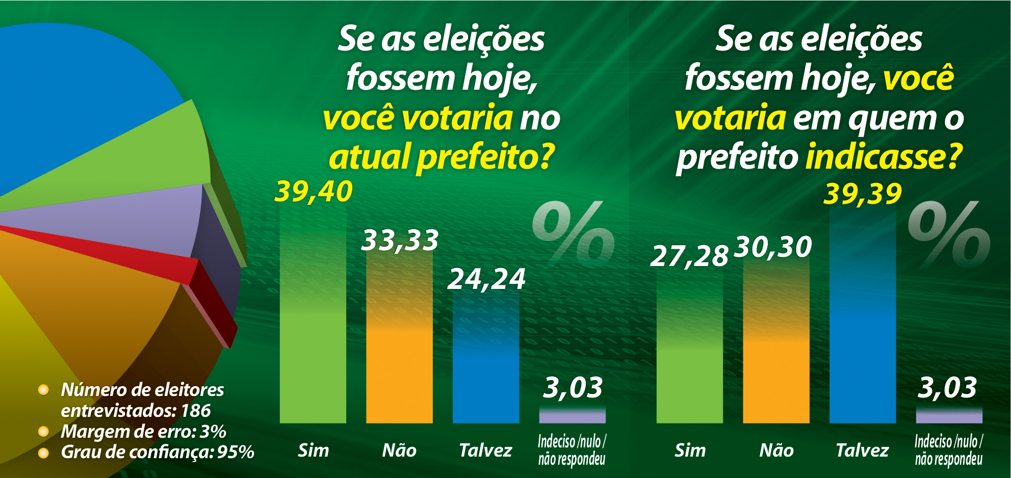 Outro quesito submetido à avaliação popular foi com o objetivo de auferir o índice de transferência de votos do atual prefeito caso ele opte por apoiar outro nome e desista da tentativa de reeleição. 27% dos eleitores afirmaram que votariam num nome indicado por ele. Há oito meses esse índice era de 20%. 30% cravaram, incondicionalmente, que “não” (contra 32% em Abril) e 39% disseram que “talvez” (contra 37% na pesquisa anterior). Aqui se agrupam aqueles que esperam o nome escolhido para, posteriormente, decidirem.