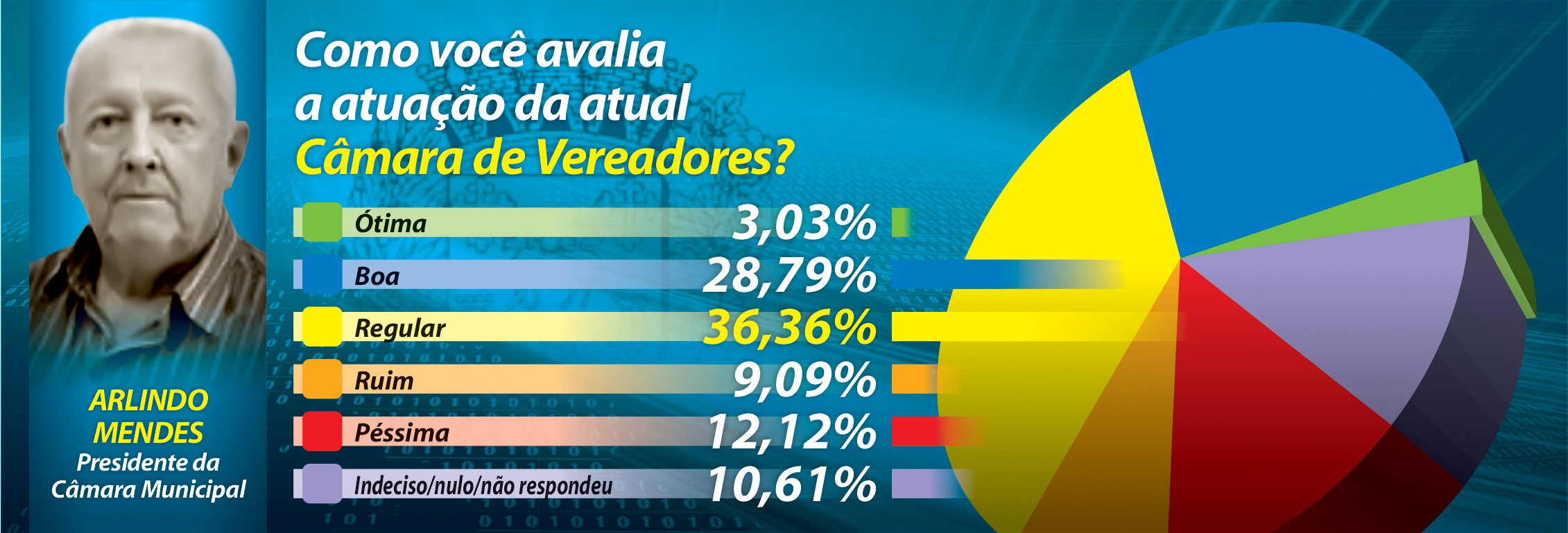 A estabilização dos índices de aprovação, transferibilidade e de favoráveis à eventual tentativa de reeleição, com sensível diminuição das taxas de desaprovação administrativa e de rejeição à nova candidatura. Eis as principais conclusões auferidas de pesquisa de opinião pública realizada no município no último dia 14 mediante a oitiva de 186 eleitores divididos, proporcionalmente, em 4 setores. Pelos dados resultantes, a atual administração municipal capitaneada pelo prefeito José Baruci-PR e vice-prefeito João Maria Fernandes-MDB, tem a aprovação de 46% dos entrevistados que a qualificam como “ótima” ou “boa”. No lado oposto estão 9% que a adjetivam como “ruim” ou “péssima”. Outros 39% classificam como “regular”.