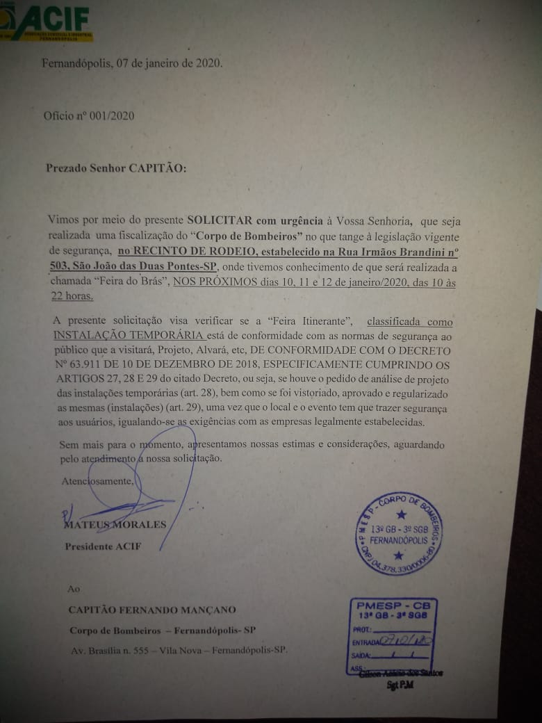 Ofício enviado pela entidade ao Corpo de Bombeiros, pedindo esclarecimentos sobre a situação da Feirinha da Madrugada frente ao órgão