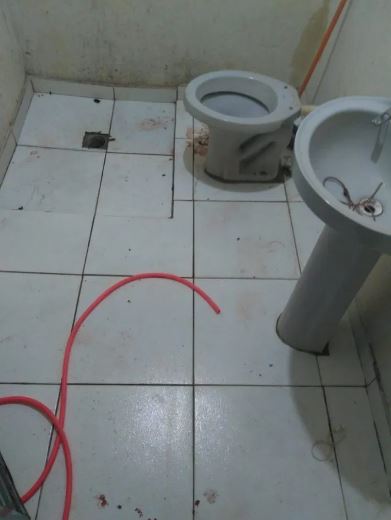 Uma mangueira de água estava conectada da torneira da cozinha até o banheiro. A polícia suspeita que a água estivesse sendo usada para ajudar no escoamento do sangue para o ralo do banheiro.