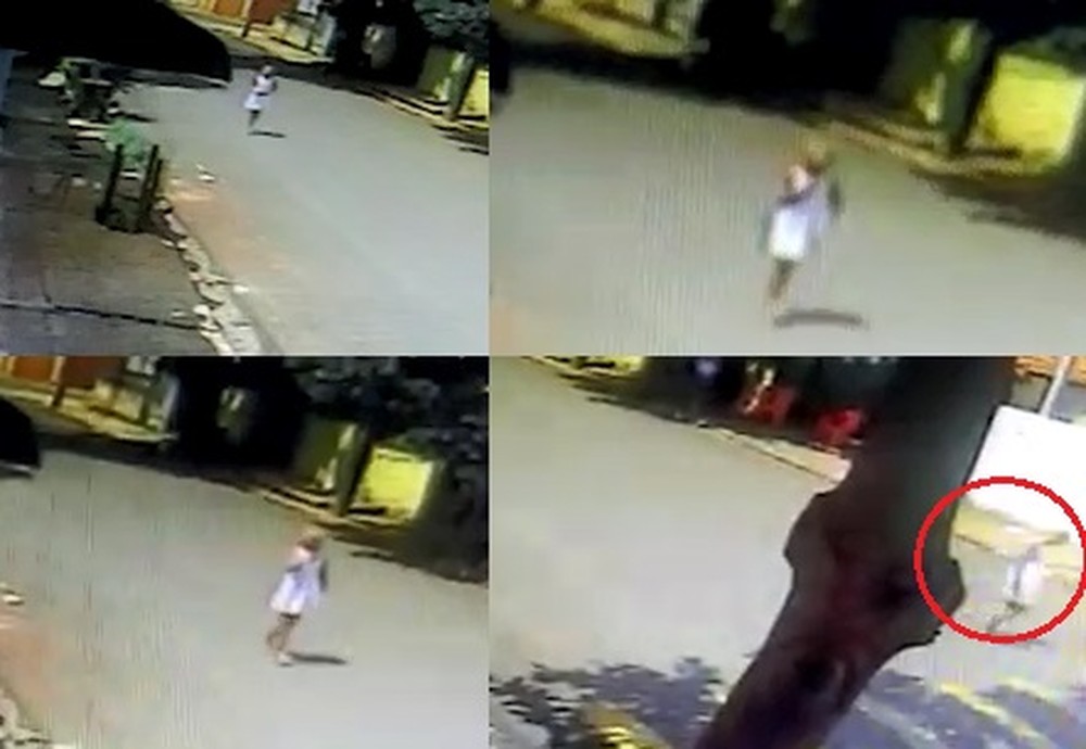 Depois, em outra câmera de segurança, o suspeito é visto perto da praça de camiseta vermelha e em uma bicicleta. Ele vai na direção da criança, que aparece no canto direito de vestido branco, e faz abordagem. Em seguida, ele sai com a bicicleta e a menina é vista atravessando a via