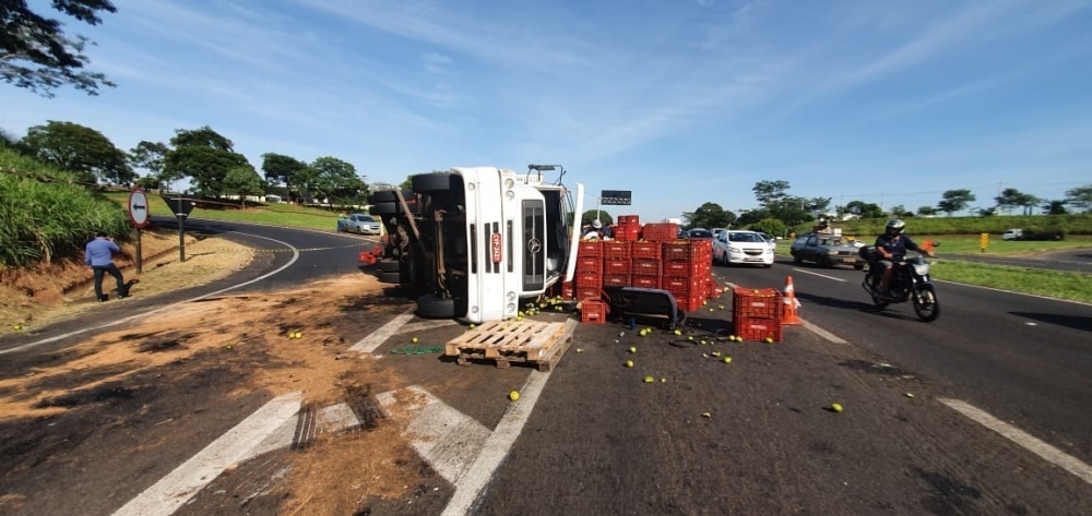 Um caminhão carregado de laranja, limão e manga tombou na rodovia Washington Luís (SP-310), no trecho que passa por Rio Preto, sentido São Paulo. O acidente aconteceu na manhã desta quinta-feira, 16, e uma das alças de acesso para os motoristas que seguem pela BR-153 para entrar na Washington Luís, sentido capital paulista, está interditada.