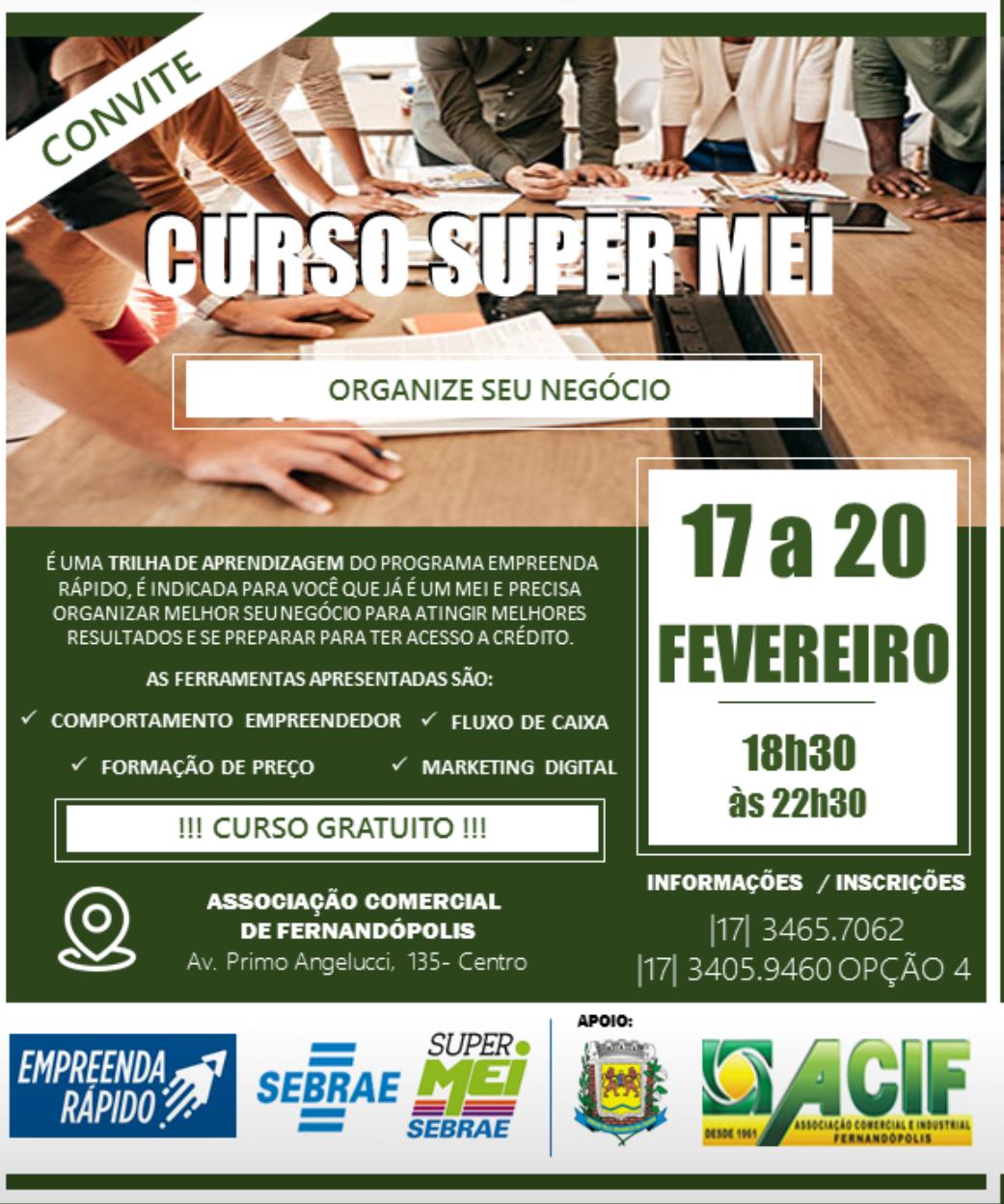 Estão abertas as inscrições para o curso “Super MEI – Organize seu Negócio”, que será oferecido gratuitamente pelo Sebrae-SP em Fernandópolis de 17 a 20 de fevereiro, das 18h30 às 22h30.