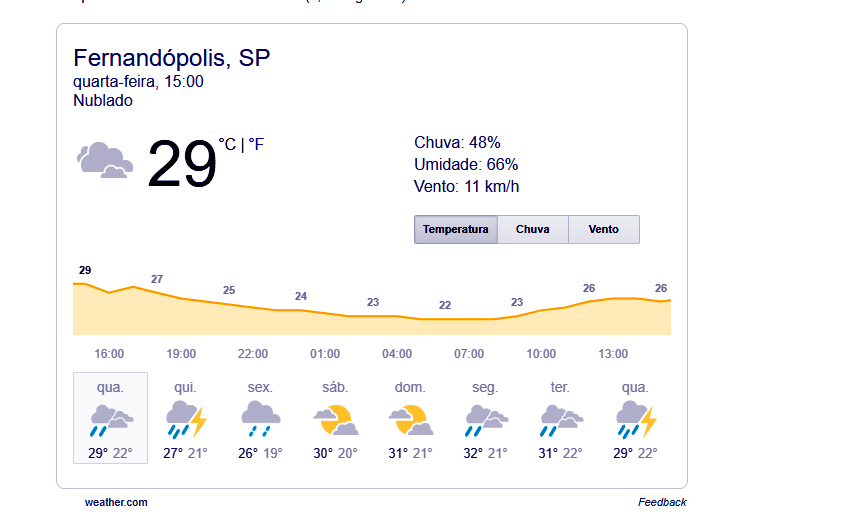 A previsão do Instituto Nacional de Meteorologia-INMET é de chuvas em Fernandópolis e na região a partir desta quinta-feira, 23. Com termômetros entre 22 e 29 graus Celsius, o dia deve começar nublado a encoberto, com pancadas de chuva e trovoadas isoladas. Segundo a previsão, o tempo fecha a tarde, com fortes pancadas de chuva durante a noite. Durante todo dia há possibilidade ventos com rajadas, segundo o instituto.