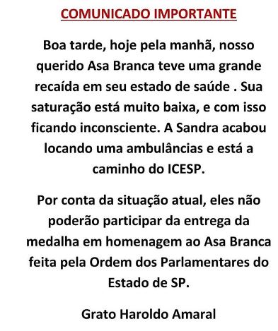 Segundo a família, Asa Branca seria homenageado neste fim de semana com a medalha da Ordem dos Parlamentares do Estado de São Paulo, mas, por conta do agravamento da doença, ele não pode participar.