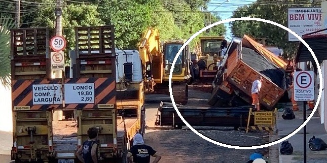 O fato aconteceu na tarde desta segunda-feira, 27, no trecho em que se encontra em obras para instalação de galerias pluviais na Rua Das Bandeiras, em Votuporanga; Parte do trecho da rua cedeu por não suportar o pesado veiculo que trabalhava no canteiro.