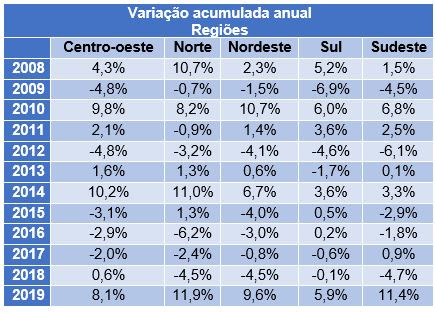 Na comparação entre os meses de dezembro de 2019 e 2018, a região Norte também se destacou (53,8%), seguido pelo Sul (26,4%), Sudeste (21,0%), Norte (19,9%) e Centro-Oeste (9,3%).