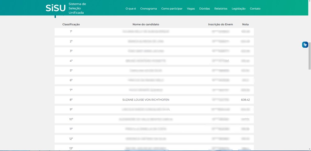 A lista dos aprovados pelo sistema foi divulgada nesta quarta-feira. 29. Suzane aparece em oitavo lugar na lista, com nota 608,42.