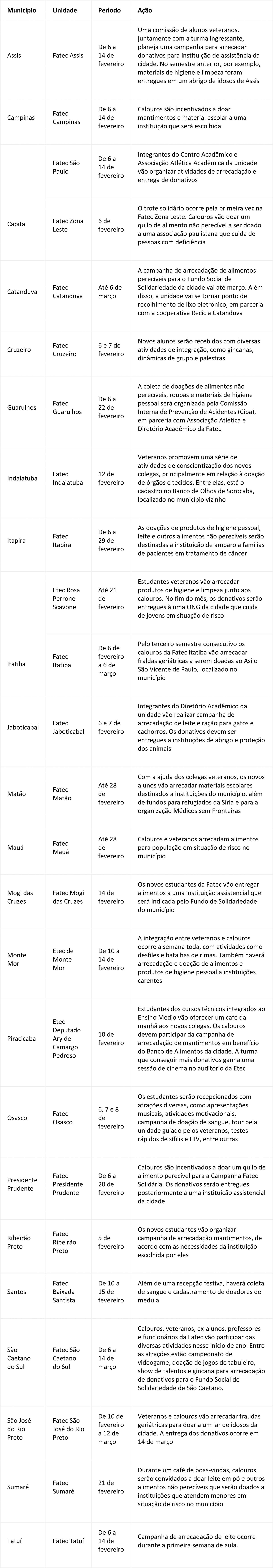 Em Piracicaba, na Etec Deputado Ary de Camargo Pedroso, estudantes dos cursos técnicos integrados ao Ensino Médio vão oferecer um café da manhã aos novos colegas. Os calouros devem participar da campanha de arrecadação de mantimentos em benefício do Banco de Alimentos da cidade. A turma que conseguir mais donativos ganha uma sessão de cinema no auditório da Etec.
