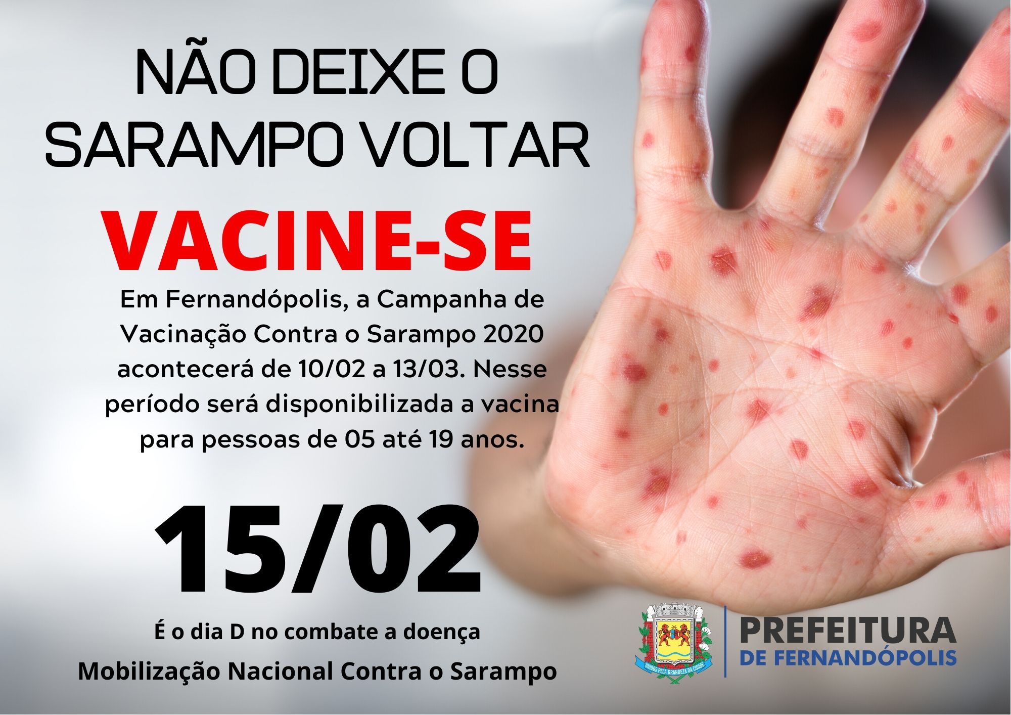 A Secretaria Municipal de Saúde de Fernandópolis realiza até o dia 13 de março a primeira etapa da Campanha Nacional de Vacinação contra o Sarampo. Todas as salas de vacina têm as doses para a população.