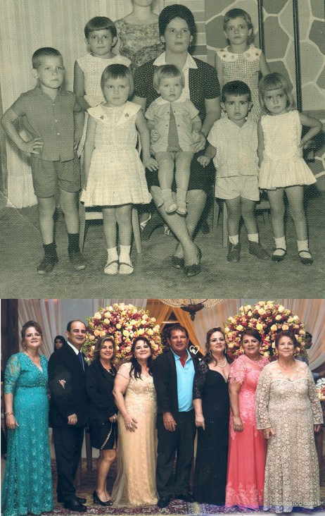 Na imagem superior, de 1964, Tia Sebastiana (ao centro e com a filha mais nova no colo) com os seus sete filhos ainda crianças. Na imagem inferior, recente, os seus sete filhos já adultos e perfilados ao seu lado (primeira à direita)