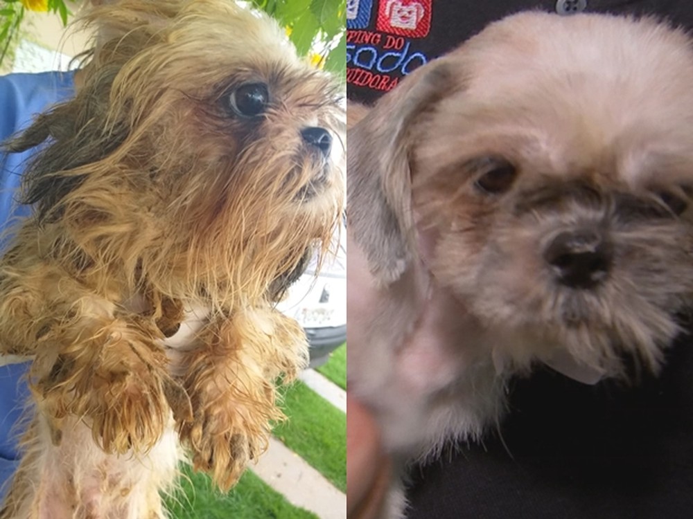 Ao lado esquerdo, um cachorro resgatado no canil, e à direita, um outro cachorro após banho — Foto: Reprodução/TV TEM