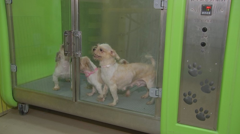 Cães resgatados em situação de maus-tratos em canil clandestino passam por banho e tosa para adoção