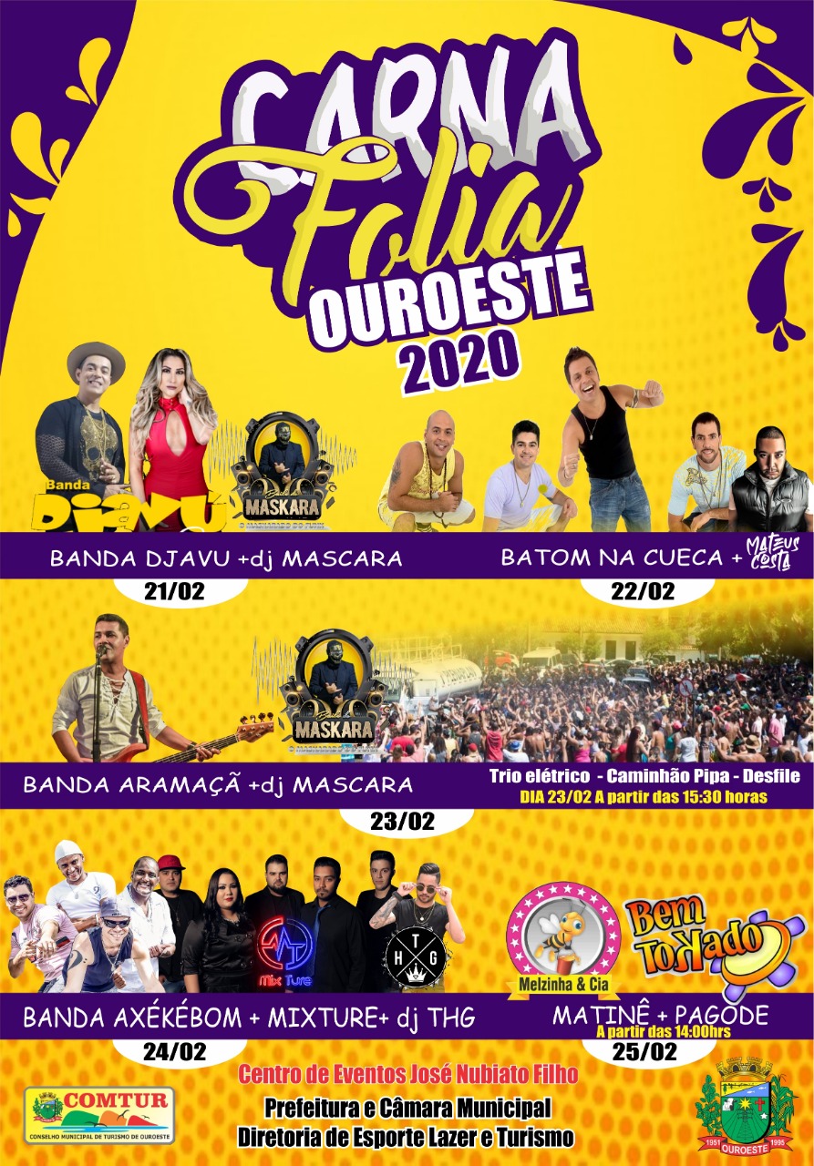 A programação do Carnafolia 2020 de Ouroeste, considerado o maior e melhor carnaval de rua da região, teve início nesta sexta-feira, dia 21 de fevereiro no Centro de Eventos José Nubiato Filho com a animação da Banda Djavú.