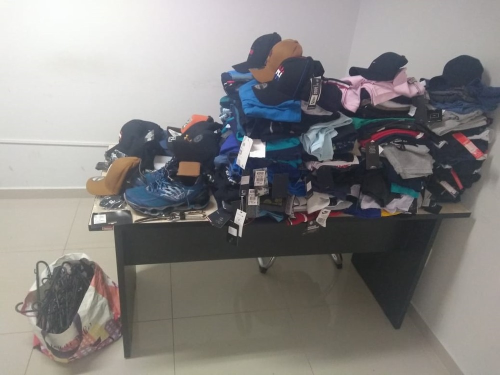 No total, a polícia recuperou 152 camisetas, 14 bonés, 41 bermudas, duas calças, tênis, óculos e relógio.