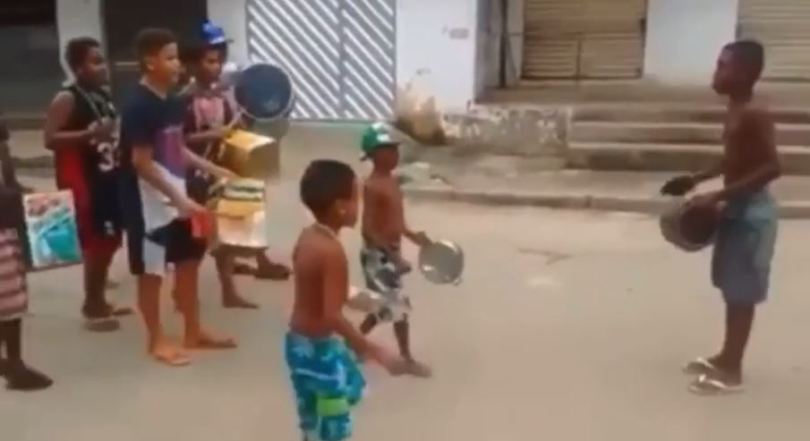 Munidas de baldes, latões e vasilhas, um grupo de crianças criou seu próprio bloquinho de Carnaval, que não ficou devendo nada para os demais!
