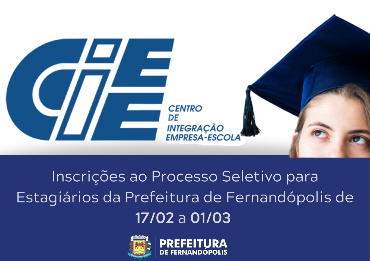 Termina no domingo, 1° de março, o período de inscrição para o processo seletivo de estagiários da Prefeitura de Fernandópolis. A prova será realizada pelo CIEE (Centro de Integração Empresa Escola) e o cadastro deve ser feito pelo site www.ciee.org.br.