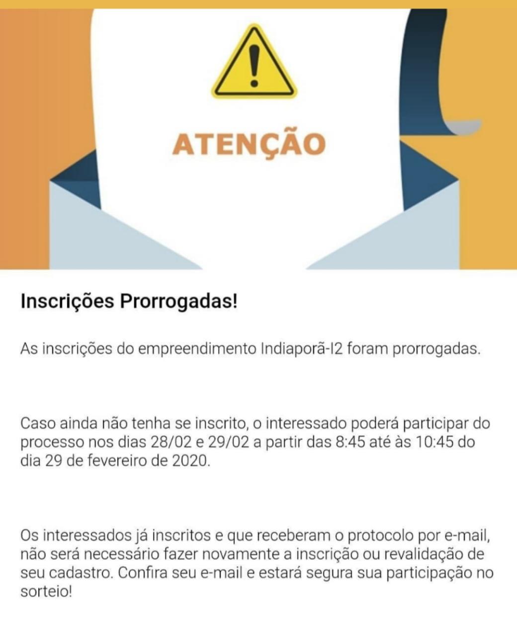A Secretaria de Estado da Habitação, por meio da Companhia de Desenvolvimento Habitacional e Urbano (CDHU), prorrogou até o dia 29, hoje, as inscrições para participação do sorteio de 10 unidades do Programa Nossa Casa em Indiaporã.