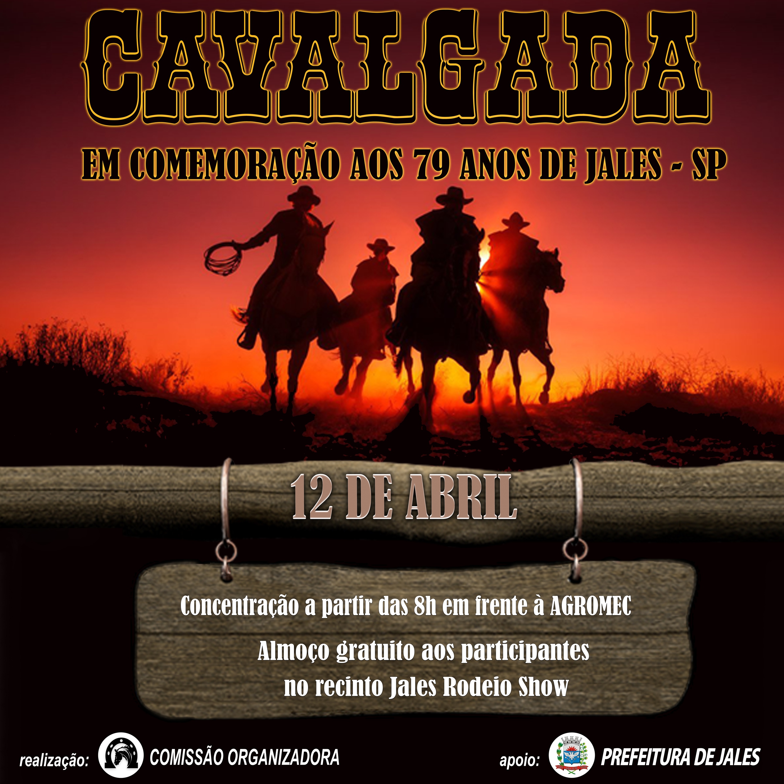 Para celebrar o aniversário de 79 anos de Jales, a Comissão organizadora com apoio da Prefeitura de Jales e parceiros vai realizar a Tradicional Cavalgada no domingo, dia 12 de abril. O evento é uma tradição de décadas e vai marcar as comemorações do aniversário da cidade celebrado no dia 15 de abril.