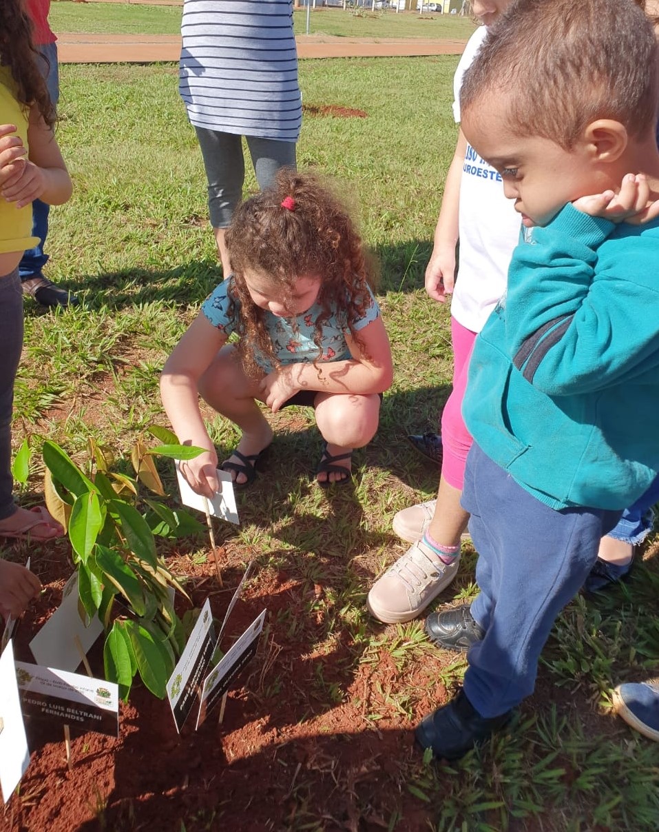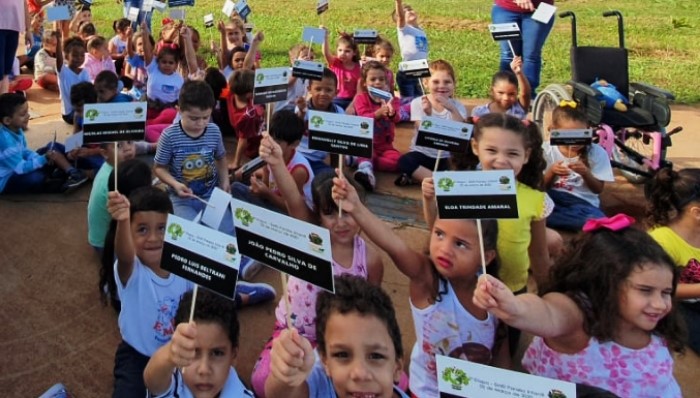 Nesta ação cada aluno recebeu uma placa com seu nome, o nome da escola e data para ser deixado junto a árvore plantada, uma forma lúdica de criar vinculo e cuidado de cada criança com sua árvore, além da conscientização na conservação do meio ambiente. Desta maneira as crianças aprendem a preservar o meio ambiente plantando árvores.
