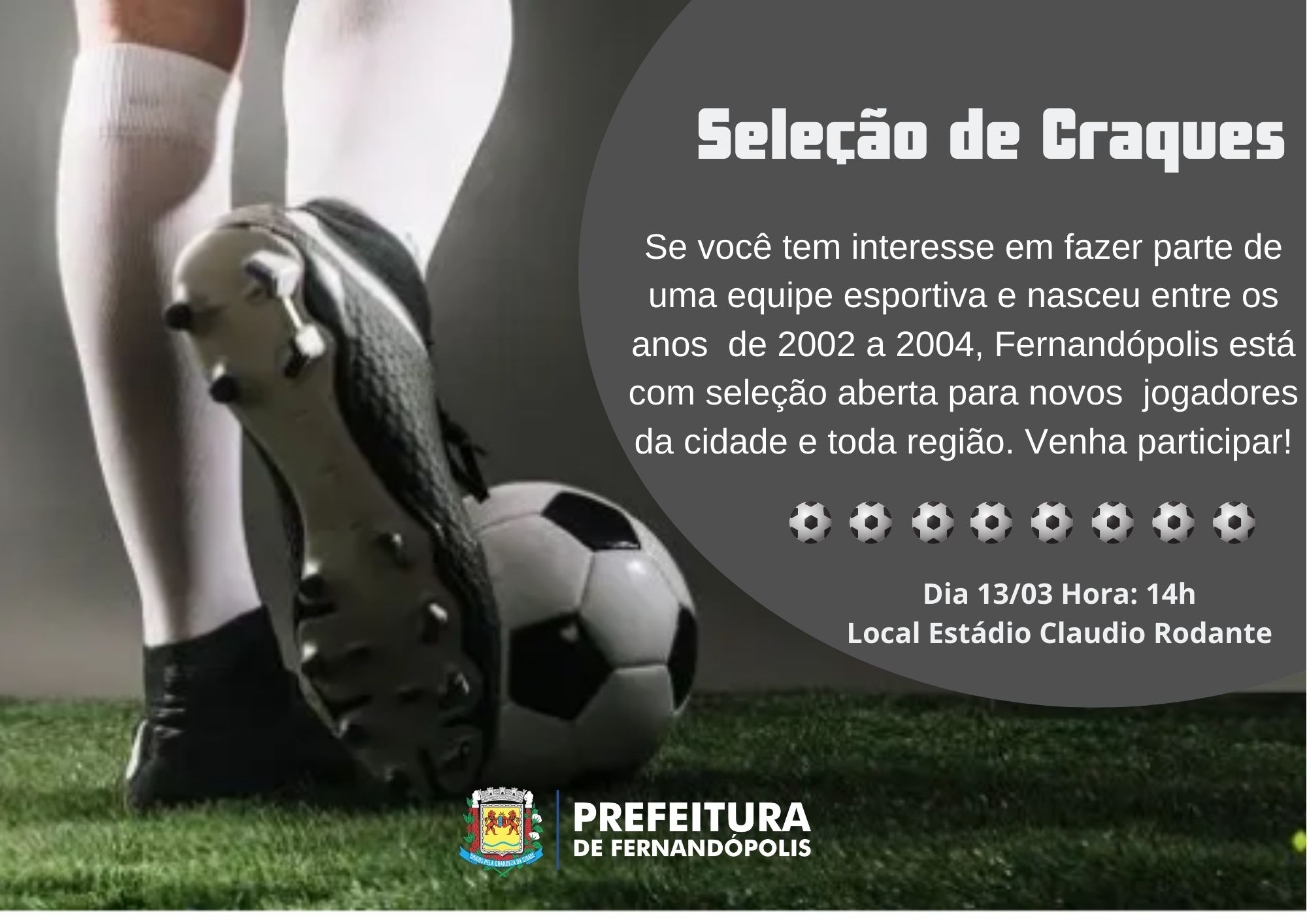 Se você nasceu entre os anos de 2002 a 2004 e tem interesse em fazer parte de uma equipe esportiva, a Secretaria Municipal de Esportes de Fernandópolis (SMEL) está com seleção aberta para novos jogadores da cidade e toda região.