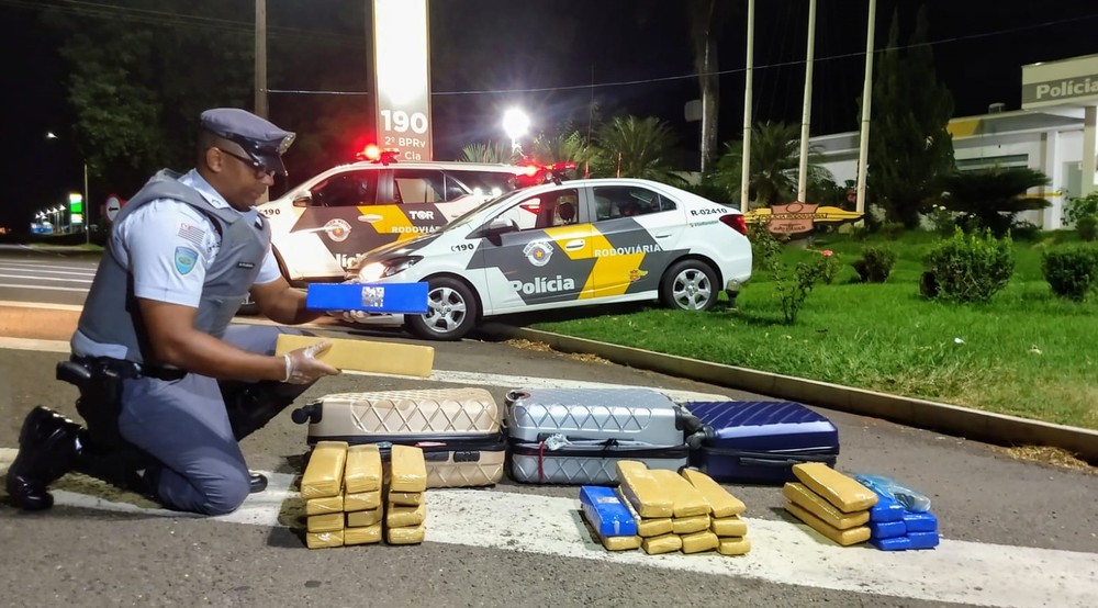 Duas malas pertenciam à mulher e continham 21 tijolos de maconha. Já na mala de adolescente de 13 anos, que acompanhava a mulher, foram localizados 12 tijolos de maconha.