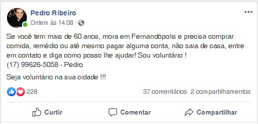 A iniciativa de Leonardo ganhou adeptos na rede social, na qual muitos fernandopolenses elogiaram a ação do jovem e também se colocaram dispostos a ajudar, da mesma forma, os integrantes do grupo de risco.