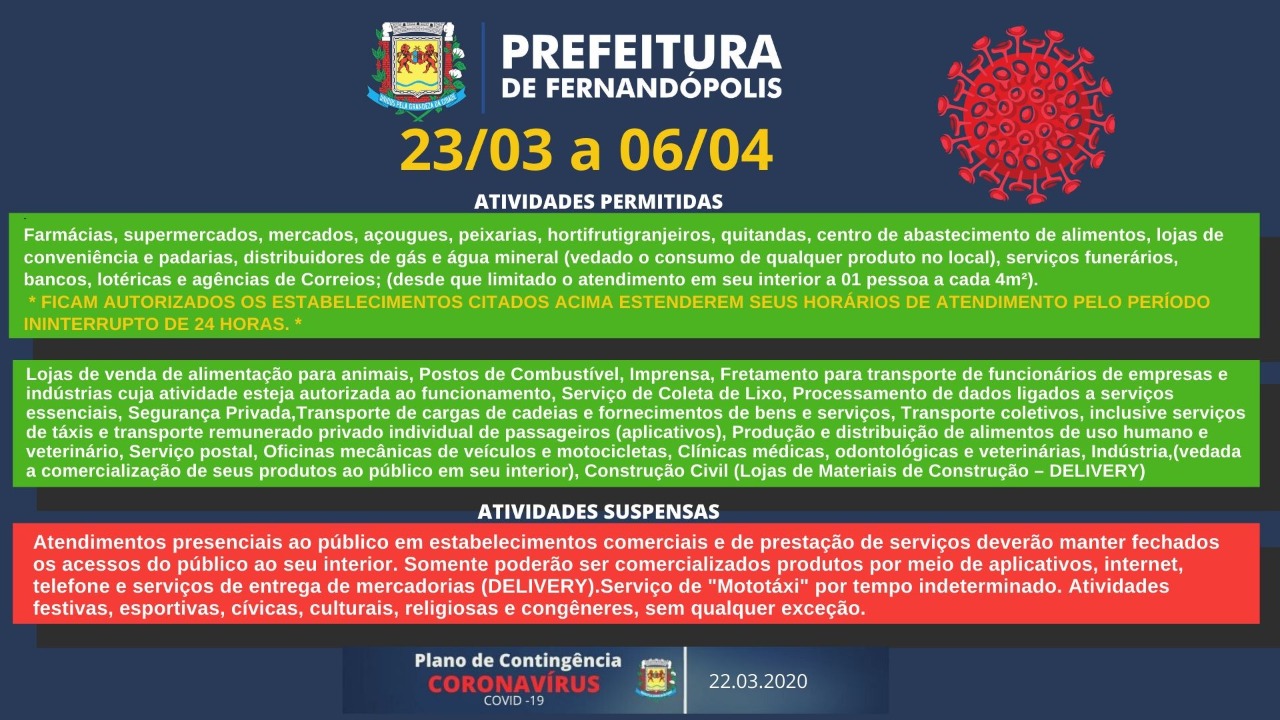 Na oportunidade, foram respondidas diversas perguntas dentre os quase dois mil comentários publicados em busca de informações sobre o assunto.Também foi divulgado o novo decreto que entra em vigor a partir desta segunda-feira, dia 23, e vai até o dia 06 de abril de 2020, estabelecendo novas medidas a serem adotadas no município, com o fechamento de todo comércio, exceto para serviços essenciais.
