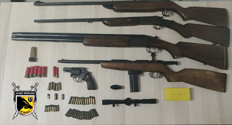 Segundo informações preliminares do Baep, o garoto estava pilotando uma moto furtada quando foi abordado. Durante buscas na casa dele, os policiais encontraram espingardas calibre 12, 36 e sob pressão adaptada para calibre 22, além de um revólver calibre 38 e uma mira laser. Várias munições de vários calibres também foram apreendidas.