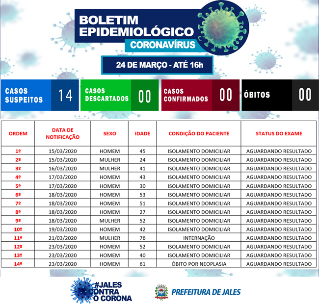 O número oficial de casos suspeitos em Jales não aumentou nas últimas 24 horas e continua em 14. A lista inclui um paciente que faleceu ontem, cujo resultado do exame ainda não foi informado pelo laboratório. Ele estava internado desde o dia 17 e foi a óbito ontem, 23 de março, às 8:29 horas.