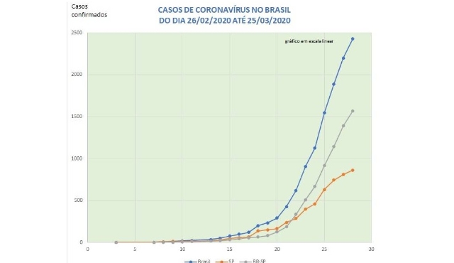 A curva azul da imagem mostra a evolução de casos do Brasil. A laranja, no Estado de São Paulo e a cinza, uma menos a outra. Até o dia 18, pela trajetória das linhas, SP impulsiona o número de casos no país e, a partir do dia 19, já começa a mostrar uma acentuada desaceleração.