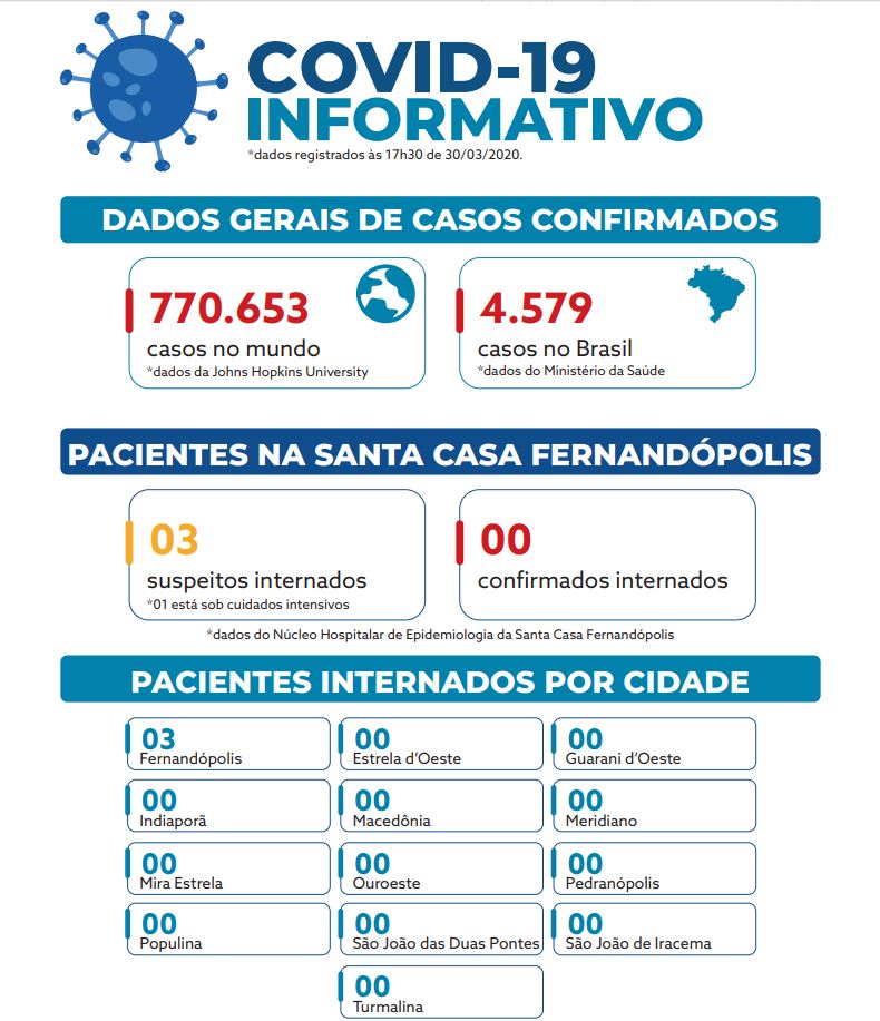 A Santa Casa de Fernandópolis também começa a divulgar, a partir dessa segunda-feira, 30, boletins sobre casos de coronavírus tratados no hospital. O informativo da instituição é referente aos 13 municípios atendidos na microrregião de Fernandópolis.