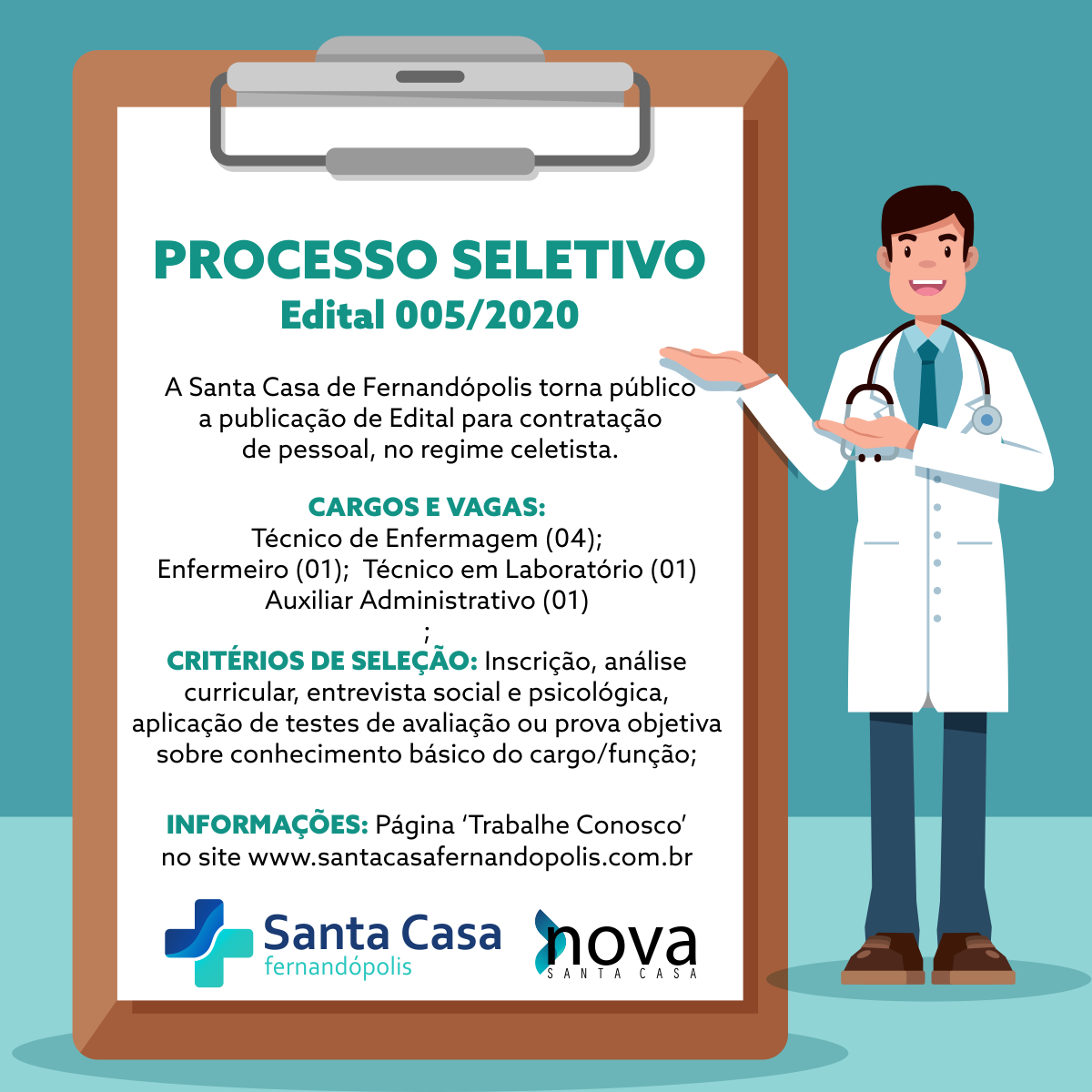 A Santa Casa de Fernandópolis publicou nessa sexta-feira, 3, edital de processo seletivo para a contratação de pessoal. São sete vagas distribuídas nos seguintes cargos: quatro técnicos de enfermagem e uma vaga para enfermeiro, técnico em Laboratório e auxiliar administrativo.