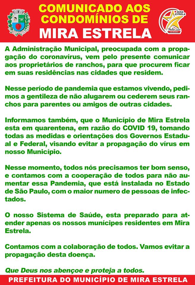 Na manhã desta sexta-feira, dia 3, a Prefeitura de Mira Estrela, município localizado a 37 quilômetros de Fernandópolis, emitiu um comunicado, em sua rede social, destinado aos condôminos. A recomendação tem como finalidade, evitar o fluxo de turistas na região.