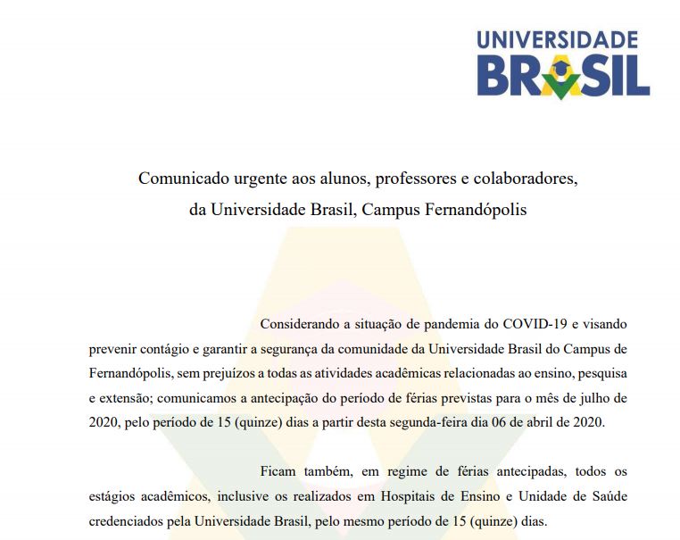 Considerando a situação de pandemia do COVID-19 e visando prevenir contágio e garantir a segurança da comunidade da Universidade Brasil do Campus de Fernandópolis, sem prejuízos a todas as atividades acadêmicas relacionadas ao ensino, pesquisa e extensão; comunicamos a antecipação do período de férias previstas para o mês de julho de 2020, pelo período de 15 (quinze) dias a partir desta segunda-feira dia 06 de abril de 2020.