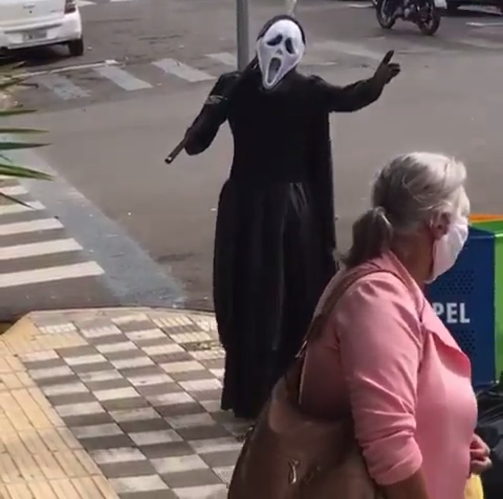 Em seguida, o homem conversa com uma pessoa que não aparece na gravação. No entanto, é possível escutar o diálogo entre os dois. “Conscientizando só. É uma brincadeira consciente. Estou atrapalhando? Obrigado”, diz a ‘Morte’, que não teve a identidade revelada.