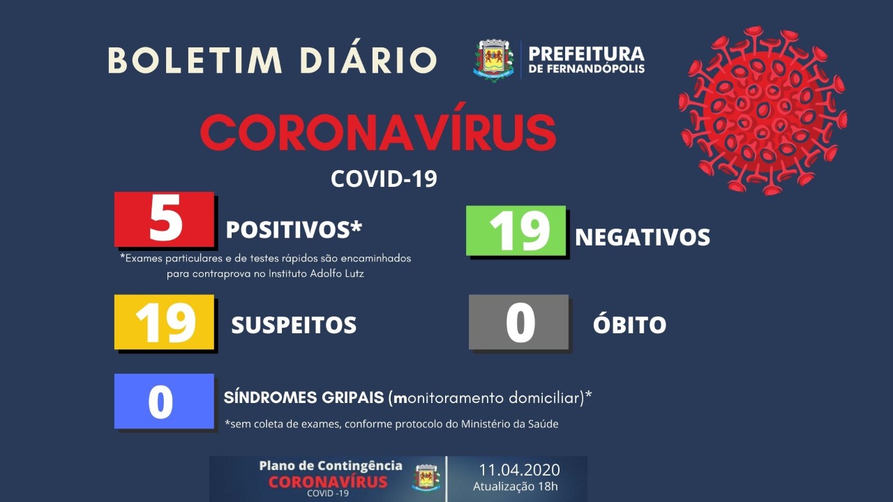 Fernandópolis manteve nesse sábado, 11, cinco casos positivos para coronavírus no município.
