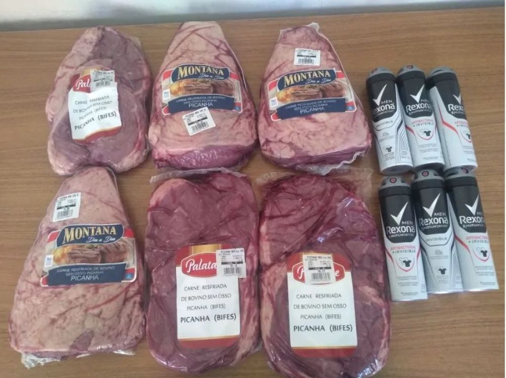 Ela foi abordada já do lado de fora do prédio e dentro da bolsa dela havia seis pacotes de picanha, totalizando 6,2 quilos e R$ 250,89, além de frascos de desodorante, somando R$ 80,84.
