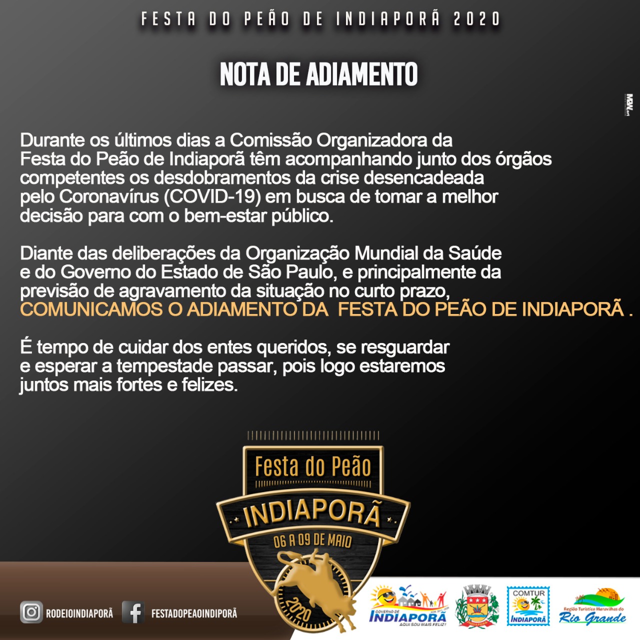 Diante das deliberações da Organização Mundial da Saúde e do Governo do Estado de São Paulo, e principalmente da previsão de agravamento da situação no curto prazo, COMUNICAMOS O ADIAMENTO da Festa do Peão de INDIAPORÃ .