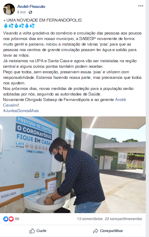 “Visando a volta gradativa do comércio e circulação das pessoas aos poucos nos próximos dias em nosso município, a Sabesp novamente de forma muito gentil e parceira, iniciou a instalação de várias ‘pias’ para que as pessoas nos centros de grande circulação possam ter água e sabão para lavar as mãos”, disse o prefeito em publicação.