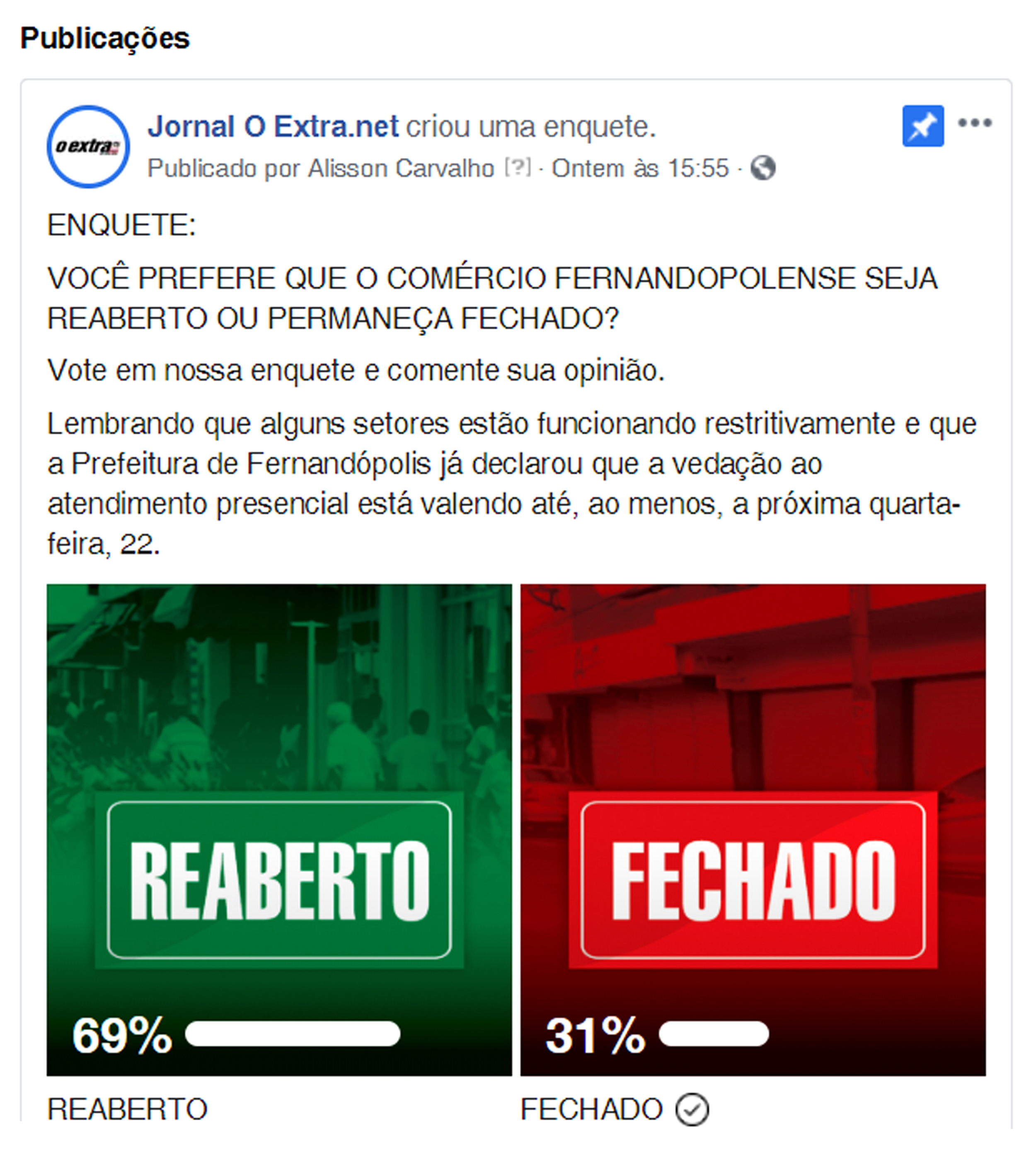 Enquete realizada na página do Facebook de O Extra.net, mostrou que praticamente 2/3 dos votantes são favoráveis a reabertura do comércio em Fernandópolis.