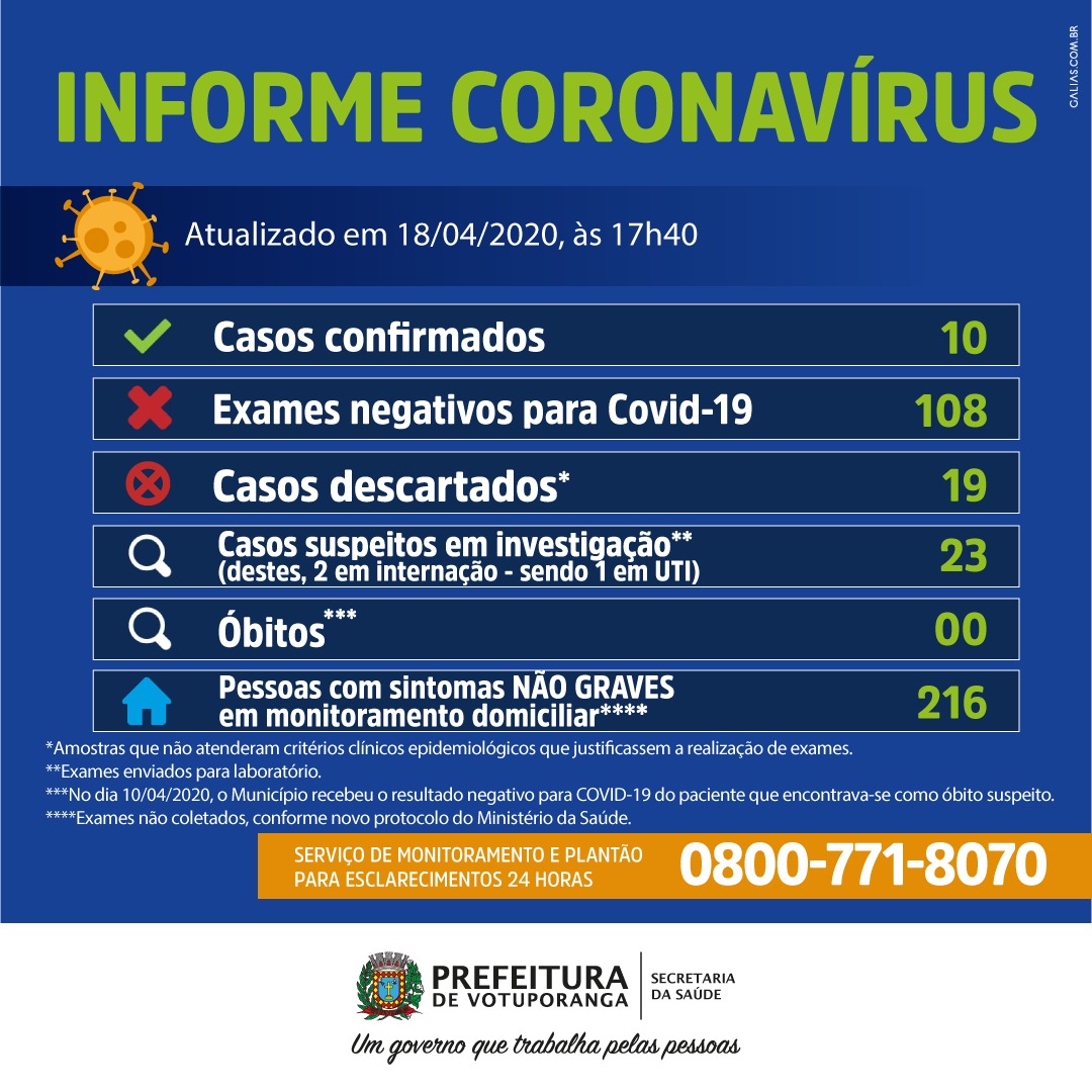 A Secretaria de Saúde de Votuporanga confirmou neste sábado, 18, mais três casos de coronavírus no município. Agora são 10 os testes positivos.