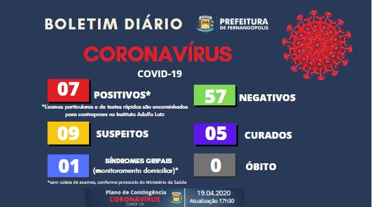 A Prefeitura de Fernandópolis divulgou nesse domingo, 19, mais um boletim epidemiológico com os casos de coronavírus no município.