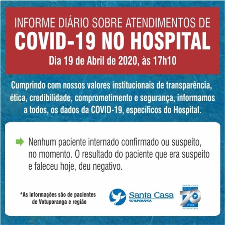 De acordo com o boletim emitido pelo hospital, nenhum paciente com suspeita ou confirmação para Covid-19 está sob cuidados da instituição.]