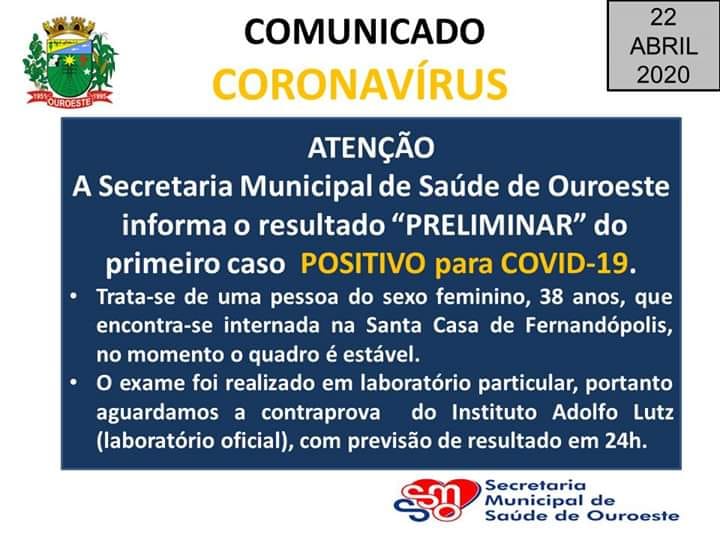 Um comunicado divulgado através de rede social emitido pela Secretaria Municipal de Saúde de Ouroeste indica que o município pode ter registrado o primeiro caso positivo para a Covid-19.
