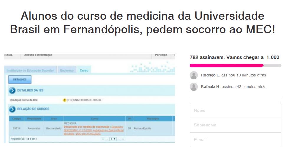 “Nós abaixo-assinados, alunos do curso de medicina da Universidade Brasil, campus Fernandópolis/SP, solicitamos o auxílio de Vossa Excelência, a fim de efetivar a política de transferência assistida do Sistema Federal de Ensino, nos termos do inciso III do artigo 57 do Decreto nº 9.235, de 15 de dezembro de 2017”, diz o texto publicado no site de petições online Avaaz.