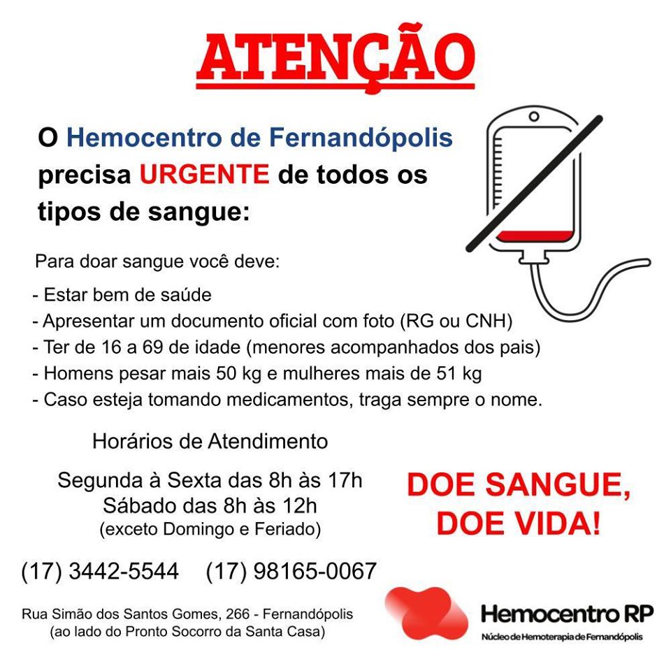 O horário de funcionamento do Hemocentro de Fernandópolis é de segunda a sexta-feira, das 8h às 17h, especialmente de quarta-feira até as 18h. Aos sábados das 8h às 12h. A Unidade fica na Rua Simão dos Santos Gomes, n.º 266, no Jardim Santista, ao lado do Pronto Socorro da Santa Casa de Fernandópolis. Informações pelo (17) 3442-5544.